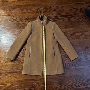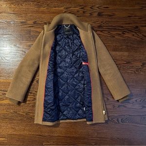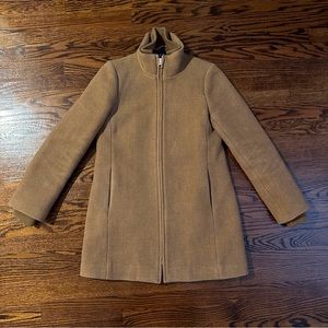 Stylish tan jacket from J. Crew. Features a sleek design with a high collar. Perfect for layering. I love this coat, just need a different size. The lining and cotton fabric at the neck make it very comfortable.