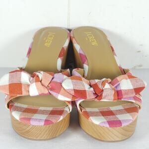 J. Crew Women's US7,5 Multicolor Plaid Printed Bow Wooden Heels Mules Sandals Nw