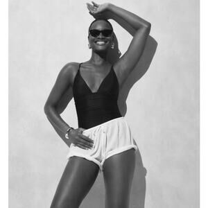 Especially this one-piece suit, with a classic, flattering, deep V-neck.