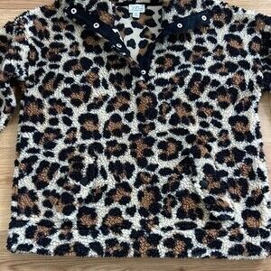 Sherpa fleece pullover with pockets and button snap closure. Leopard Animal Print.