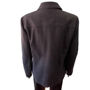 This J. Crew vintage women’s full zipper jacket is 80% wool, 20% nylon with a cotton and acetate lining. Dry clean. The wolf feels almost like boiled wool because it is heavy and substantial. Warm and cozy, perfect for a winter day. Faux flap pocket on chest, slit hip pockets. Preppy, minimalist, military style.