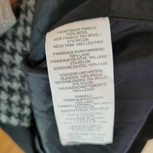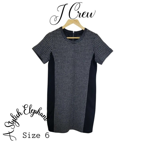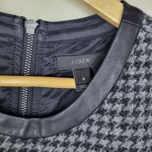 J Crew 100% wool black and gray houndstooth, crew neck, sheath dress in size 6. Side panels in solid black, short sleeves, vegan leather trim around neckline, exposed back zipper. In excellent preowned condition.