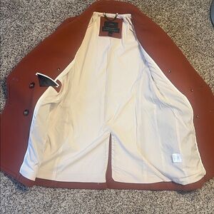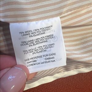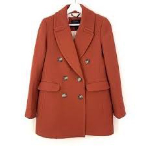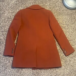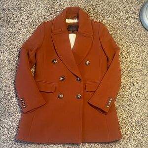 J. Crew Wool Blend Double-Breasted Peacoat. Featuring a beautiful burnt orange color. Made from their signature "double-cloth wool" by Italy's Nello Gori mill. This style is a popular classic known for its structured, polished feel. Fully lined in a striped white and beige lining. Notched or peak lapels, a double-breasted button front closure, front flap pockets. Light shoulder pads.
