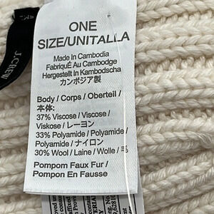 J. Crew Wool Blend Ribbed Pom Pom Beanie in Ivory - NEW - One Size. New with tags. Cozy, soft and cute—just three words to describe this classic ribbed beanie with a faux-fur pom-pom topper. Ribbed with fold up. Hat is ivory and pom pom is white. Wool, polyamide and viscose.