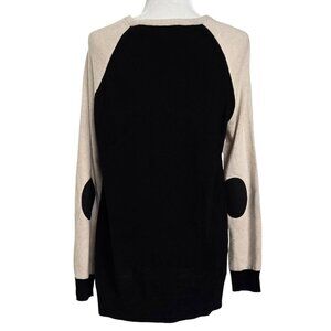 Good used condition, with no stains or tears. A tan and black crew neck sweater, with functional side buttons. Has elbow patches that add interest. Has some light piling.