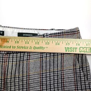 The pants feature a detailed, muted plaid pattern (tartan) in shades of grey, black, cream, and subtle red/orange. They are crafted from a comfortable Wool Blend and cut in the City Fit Skimmer style, which offers a tailored, flattering silhouette with a modern cropped/capri length. Ideal for the office, smart casual events, or a bookish weekend look.