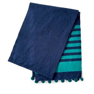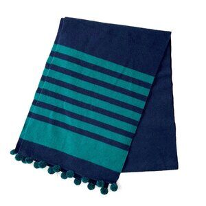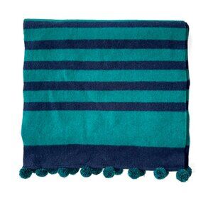 Cozy and playful, this striped scarf features bold stripes and whimsical pom pom fringe