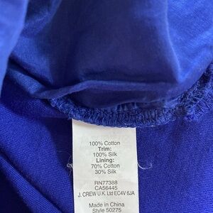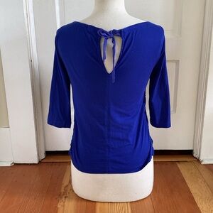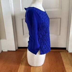 J Crew 3/4 sleeve Cobalt blue eyelet overlay top with silk tie back size extra small. Armpit to armpit 17 inches top of shoulder to bottom hem 21 inches