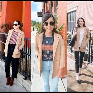 J Crew Sophie open front sweater blazer, brown camel color. Size XS. Slightly cropped sleeves. Great basic that works in casual as well as business environments. This camel color is wonderful and so versatile. Used in good condition, some light pilling and a small mark on the back.