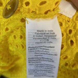J Crew Yellow Embroidered Eyelet Lace Button-Front Midi Sundress Sz 14. Clean nice condition except some minor discoloration in underarm area. Please see pics. Dress is lined but not to hem as shown in inside out pic. Straps button and are adjustable with 3 button holes.