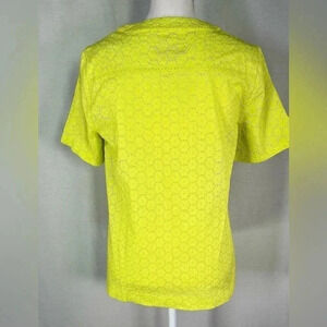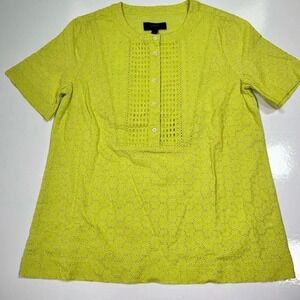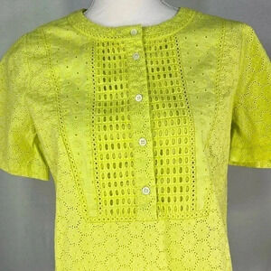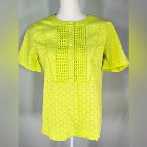 Bright yellow blouse with eyelet design. Short sleeves. Button front detail.