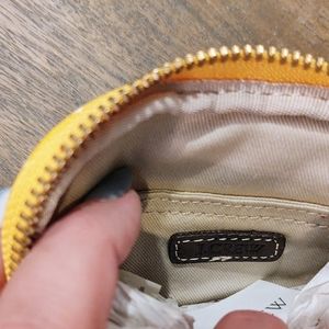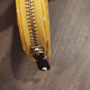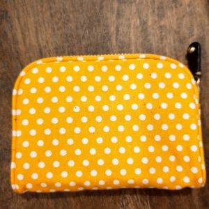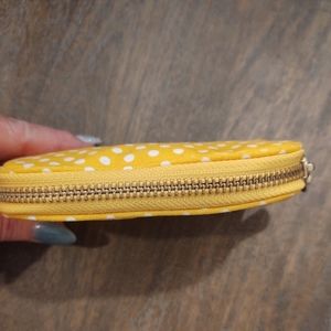 Yellow polka dot wallet with tags. Zippered pocket for change or smaller valuables on one side with logo.