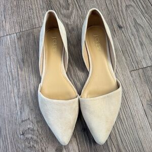 These J. Crew flats feature a sophisticated d'Orsay style with a pointed toe and a distinctive side cutout detail. Crafted in a versatile tan color, they offer a sleek and minimal design perfect for various occasions.