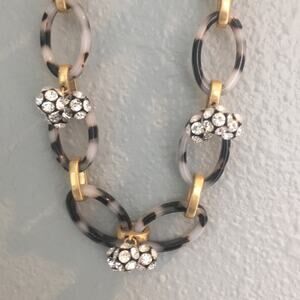 Since this necklace ties with a ribbon, it is easy to adjust the length. Shown here at a 12 inch length. The the rhinestone baubles are dispersed among gold-tone and tortoise links. This looks gorgeous dressing up a plain black sweater!