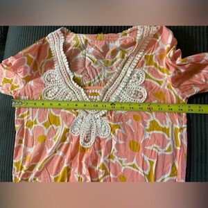 Fun mod look. Floral pattern. Crocheted accents at neckline and wrists. Wrinkles included at no extra cost 😉