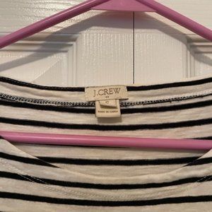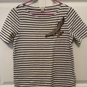J. Crew black and beige short sleeved t-shirt with jeweled bird applique. The shirt is size small with short sleeves. The overall color is beige with thin black stripes and gold jeweled bird applique on the right shoulder. The shirt is in great condition, soft and comfortable.