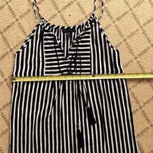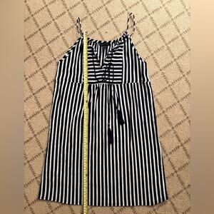 Check out this gorgeous black and white striped sundress or tunic with spaghetti straps! It’s got a cute rounded collar and front tie cords with a tassel detail. The style is super flowy and bohemian. It’s in excellent condition, with no rips, stains, or tears. It’s never been worn, so it’s like new!