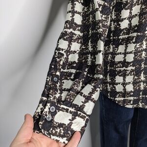 J Crew black brown cream plaid ruffle neck 100% silk button up M. Great condition.