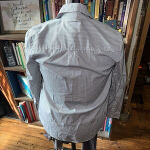 J Crew business casual, preppy, blue and white, pinstripe, boy fit, button down shirt. Pairs well with slacks or a skirt. Approximately 17 inches from armpit to armpit, 26 inches long. In good, used condition. From a pet and smoke free home.