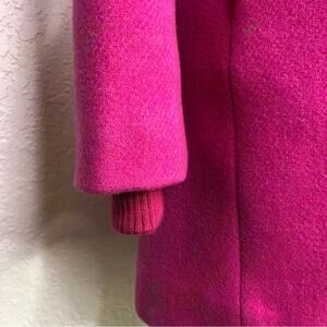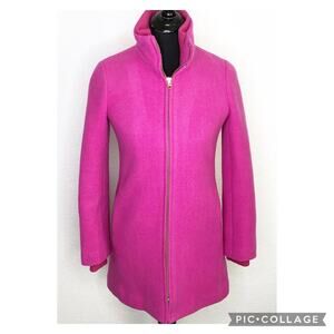 J Crew bright pink Italian Stadium Cloth by Nello Gori full zip wool blend coat. Mock collar with full zip front. Fully lined. Ribbed trim at collar and sleeve cuffs. Double side pockets and one interior pocket. Size 0. Excellent preowned condition. Minor fuzzing from wool and one tiny spot.