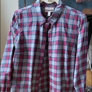 Excellent condition. The J. Crew “boy shirt”. Worn probably once. All buttons attached. Non smoking no pet home. Grey black and red with thin white lines.
