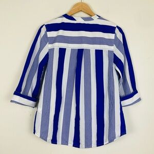 J. Crew blue and white striped collarless shirt. Button front. Three quarter length sleeves. Size XXS