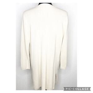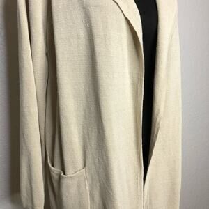 J Crew cream linen blend long open front cardigan sweater. Full open front. Double front open pockets. Long length. Side slit hemline. Size Medium. Excellent preowned condition. Minor wash wear. Imperfections in fabric due to linen.