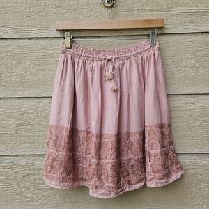 Beautiful pink a line skirt. Fully lined. Elastic waist with additional drawstring, which ends in tassels. Embroidered around the bottom third of the skirt. In good used condition with no known flaws. See photos for fabric and care details.