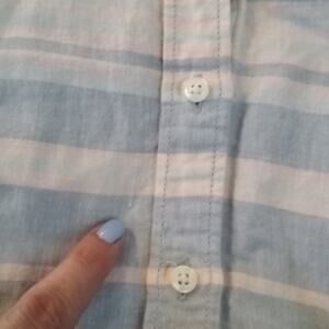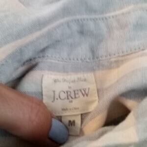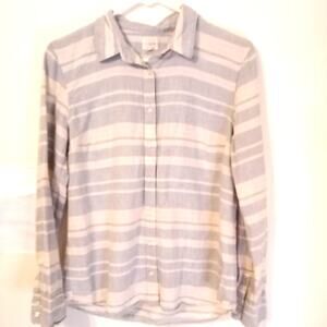 " The perfect shirt" by J.Crew factory had horizontal pastel color stripes. 58% Cotton, 42% Linen. * small snag on front near buttons ( pictured) Good pre-owned condition.