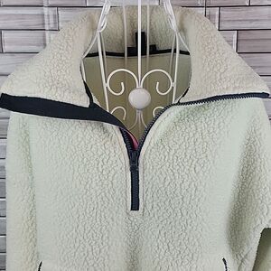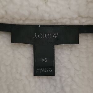 100% polyester faux sherpa fleece heavyweight fabric in this Teddy jacket by J.Crew. Pull on design with a 3/4 zipper to an extra tall storm collar for extra protection and warmth. This jacket is an unusual color. I'm going to mark it as creme but it almost has a green hue to it. Good pre-owned condition. Normal signs of wash and wear