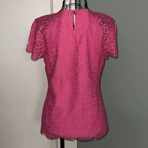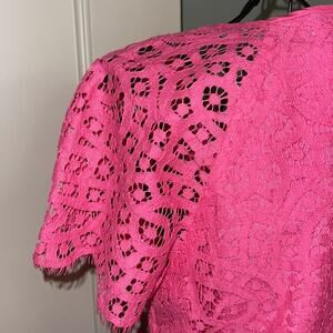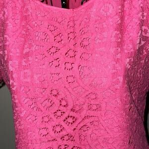 J. Crew fuscia lace overlay top with lining in the body of the shirt. No lining in sleeves. NWOT size 0