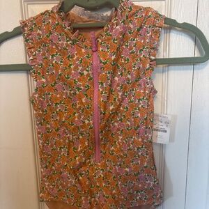 Size 10. Love the zipper for easy in and out. Cute and girlie but also perfect for having fun on the beach without worrying about straps and sun screening around delicate areas. Have this suit in a larger size and it’s great!