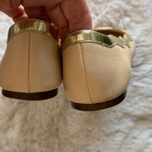 J Crew gold trimmed sand leather ballet flats. Scalloped gold wave accent. Really nice looking on and super comfortable. Some wear as shown in photos. Made in Italy size 7 GUC