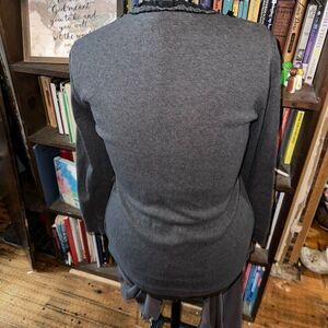 J Crew velvet ruffled, lightweight, romantic, dark academia, elevated basics, minimalist, business casual sweater. Pairs well with a blouse or shell and slacks or a skirt. Approximately 19 inches from armpit to armpit, 25.5 inches long. In good, used condition. From a pet and smoke free house.