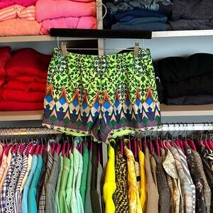 J Crew green/multicolored print 100% silk 3” shorts size 0