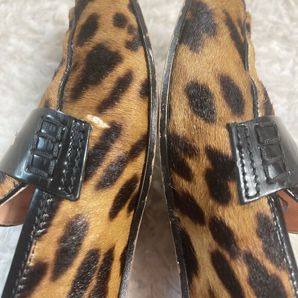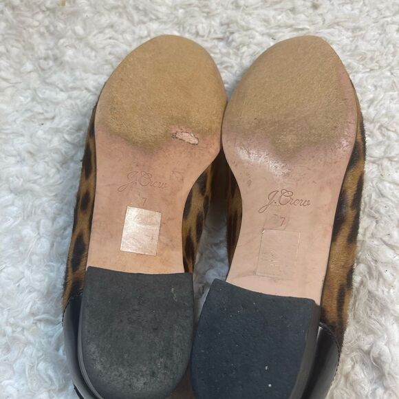 J Crew leather calf hair leopard print penny loafers size 7 pre owned in good used condition the right shoe has some peelings on the calf hair see all pictures any questions please message.M3