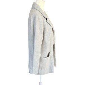 Women's J. Crew light gray long sleeve collared open cardigan sweater jacket, size small. This is a soft, stretchy, and thicker material with two deep pockets. Excellent condition and from a smoke free pet free home. Quick shipper!