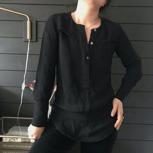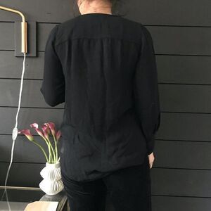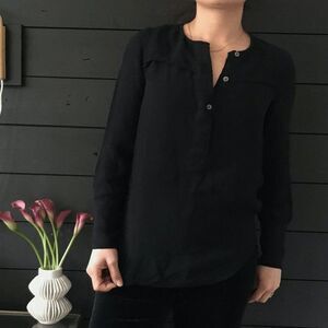 Minimalist casual black long sleeve tunic style blouse cute neck placket with buttons wide cuffs at sleeve hem Brand: J. Crew Size: 2 Fiber Content: Viscose great condition All approximate measurements taken while garment is lying flat Double where necessary Bust - 17.5" Waist - 18" Length - 25.5" Shoulders - 13.5" Sleeve - 22" Neck placket is 11.5" long cuff is 4.25" wide model is 5'2 and wears a size small