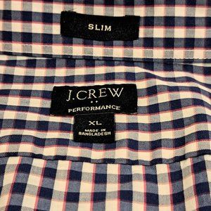 J. Crew men's XL Slim Fit Performance long sleeve button down shirt style #AS989. 68% cotton 32% polyester. Spread collar. White, blue and red plaid. Shirt is in excellent used condition. Please see photos for details and measurements. This is a slim fit shirt.