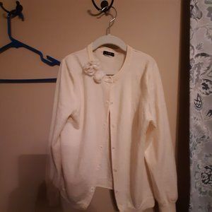 Has a hole (not noticeable). Tag cut off b/c it was itchy but it's XS, can also fit regular S. (Take my word for it; I'm not trying to trick anyone about the size lol.) Two silk flowers on lapel. 3/4 sleeves, price firm. Very soft and almost no pilling. ivory cream white blend.