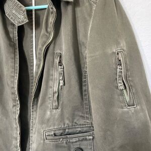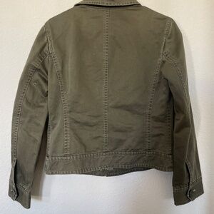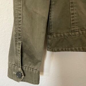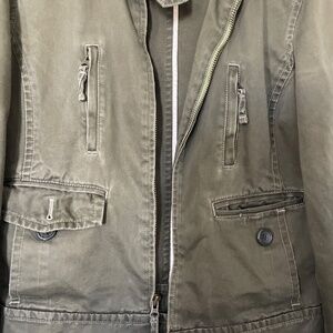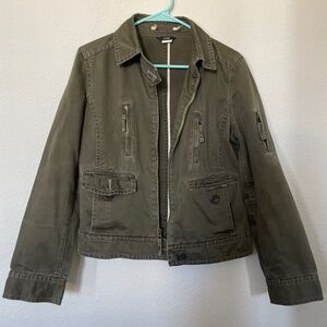 Military / olive green field jacket from J Crew. Women’s size medium. It has very useful pockets with buttons and zippers, and an arm zipped pocket. I hardly ever wore this! Good condition - there’s a tiny frayed spot on the back of the left arm, shown in the pictures, it adds character!