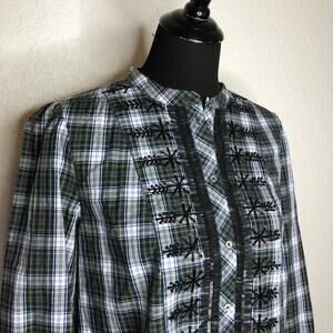 J Crew navy blue green and white plaid beaded button down top. Mock collar with full button down front. Beaded sequin design on front. Curved hemline. Button cuff sleeves. Size Small. Excellent preowned condition. One small spot as shown. 100% cotton.