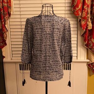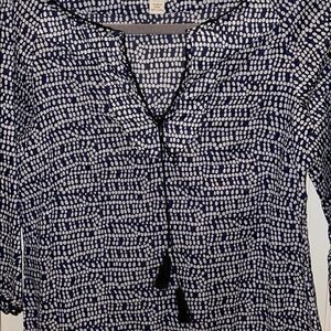 J. Crew navy/white patterned 100% cotton tunic/shirt. Tassel ties at the split at neck and on the 3/4 sleeves. Neck and sleeve end trimmed in the navy cord of ties. Size 0. Excellent condition never worn