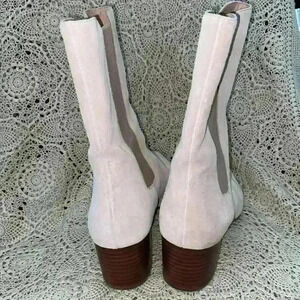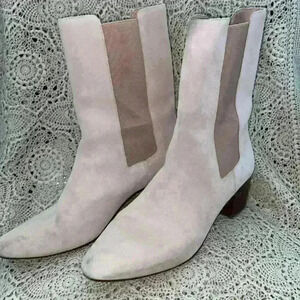 Beautiful J Crew pale pink chunky heel suede boots. Size 9.5. They are in slightly worn condition (see photos for more details on condition). 2” heel & 9” from heel to top of boot.