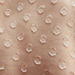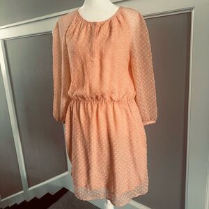J. Crew peach colored, swiss dot dress with sheer sleeves.