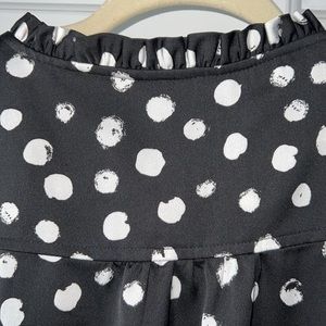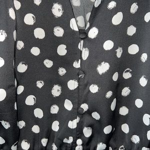 J. Crew peplum blouse. This is a black and white blouse. The material is polyester silky and luxurious feeling. V neck with three buttons. Pit to pit 20 inches and 24 length. Would look great with white jeans.