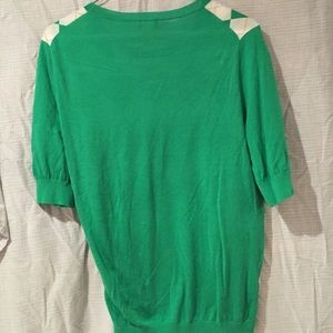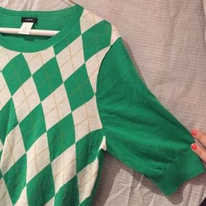 This J. Crew women's sweater is 3/4 sleeves and has a green white and gold plaid pattern on the front. Made with 100% cotton and was worn a few times but in great condition