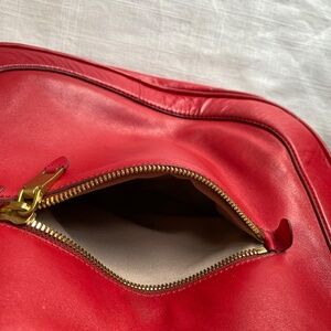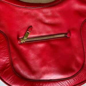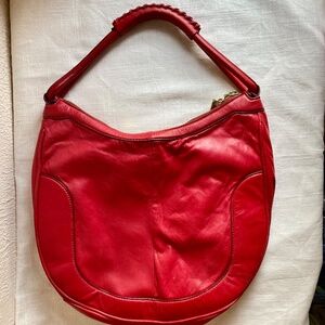 Elegant red leather J. Crew hobo style handbag with brass hardware.