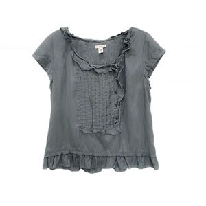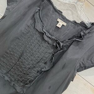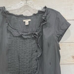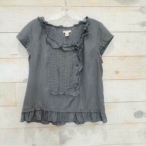 J. Crew ribbed front/ ruffle trim flare/ bib top ❤️ silk blend, size 6. Gently used in good shape! Length shoulder to hem- 21.5” bust armpit to armpit- 17”. Huge discounts on bundles! Bundle items from my closet and I will send a private offer! Reasonable offers accepted!