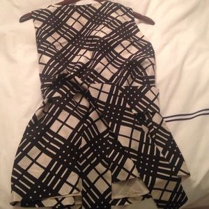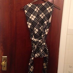 Classic sleeveless tunic style blouse. Great for the office or casual with jeans and heels. Fits to size. V neck front with tie ribbon in the back. Ribbon falls just under bust.